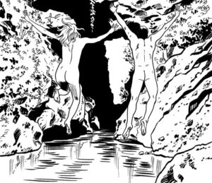 Bon, je me balade un peu dans le bois, je m’appuie contre un arbre. Bruce fait plein de croquis, puis il dit à la fille: